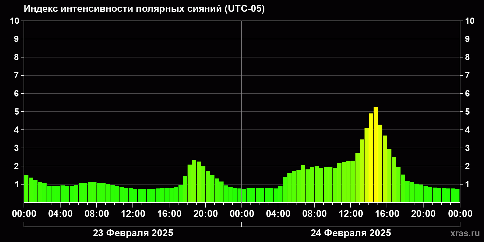 Изменения индекса интенсивности полярных сияний с 2025-02-23 по 2025-02-24 по местному времени