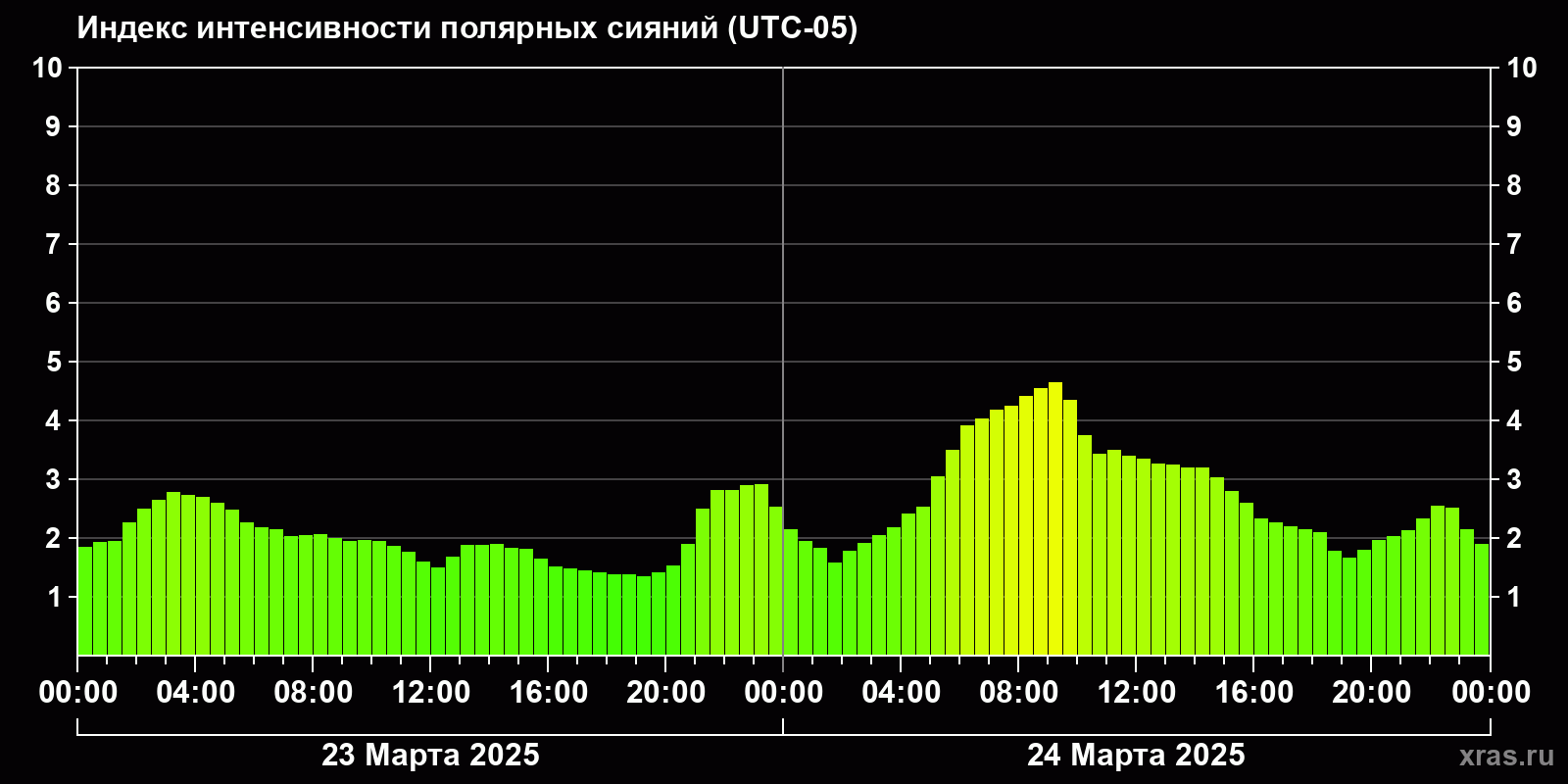 Изменения индекса интенсивности полярных сияний с 2025-03-23 по 2025-03-24 по местному времени