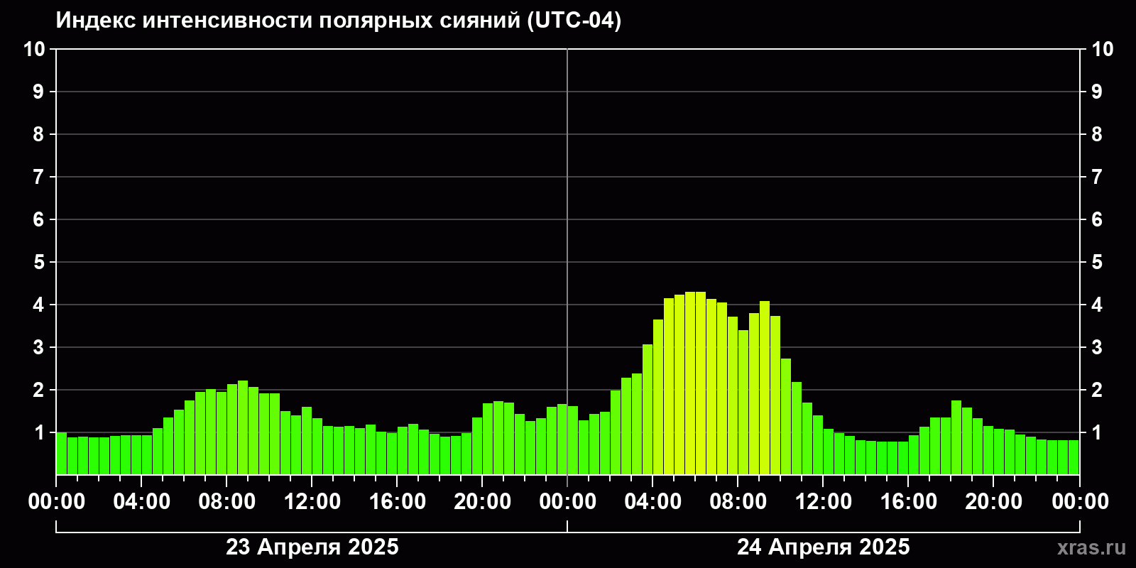 Изменения индекса интенсивности полярных сияний с 2025-04-23 по 2025-04-24 по местному времени