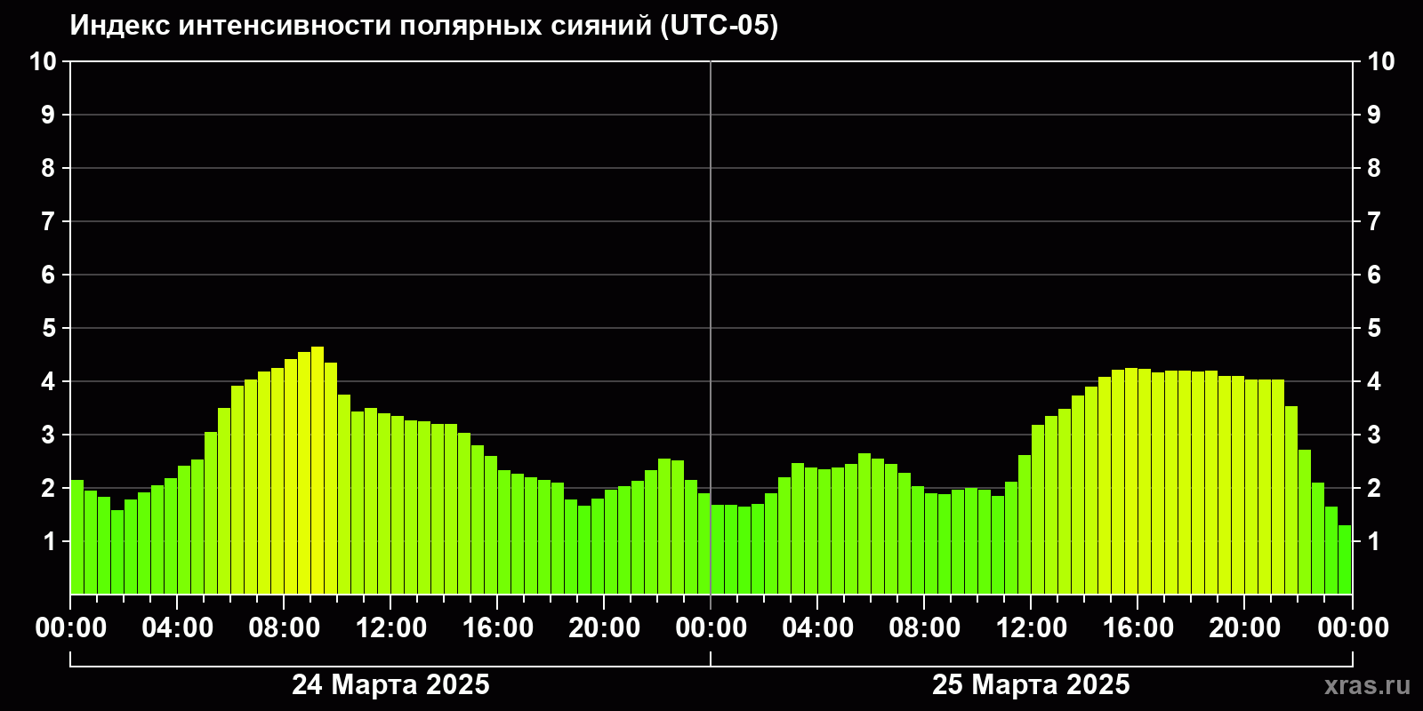 Изменения индекса интенсивности полярных сияний с 2025-03-24 по 2025-03-25 по местному времени