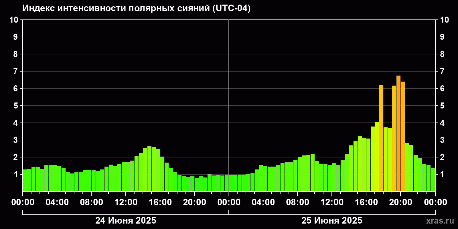 Изменения индекса интенсивности полярных сияний с 2025-06-24 по 2025-06-25 по местному времени