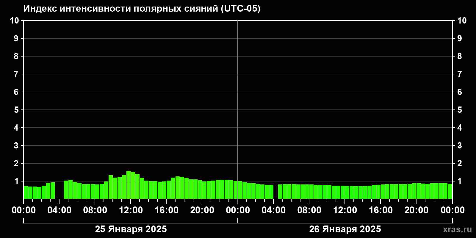 Изменения индекса интенсивности полярных сияний с 2025-01-25 по 2025-01-26 по местному времени