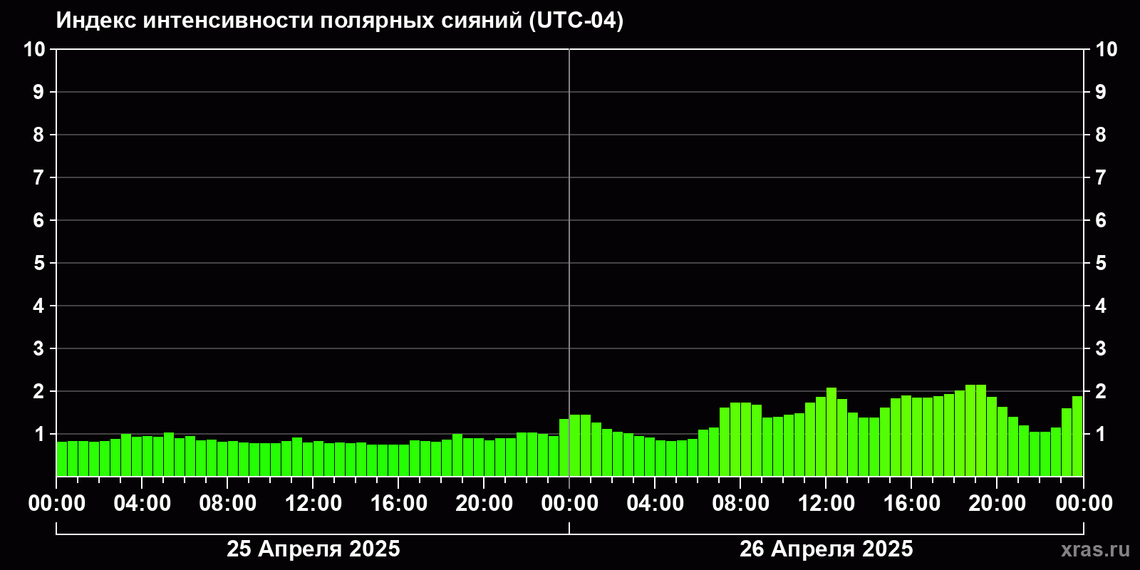 Изменения индекса интенсивности полярных сияний с 2025-04-25 по 2025-04-26 по местному времени