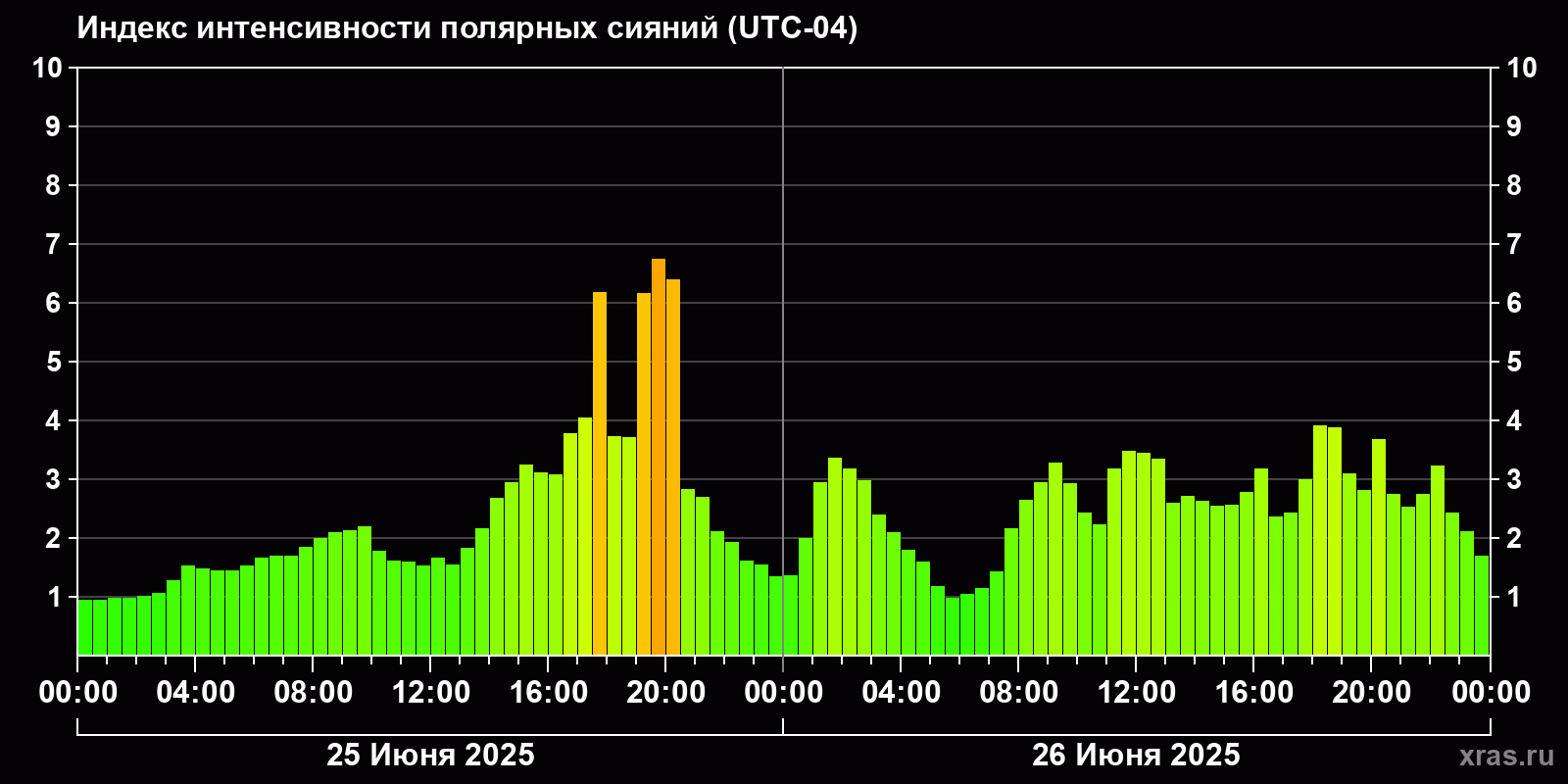 Изменения индекса интенсивности полярных сияний с 2025-06-25 по 2025-06-26 по местному времени