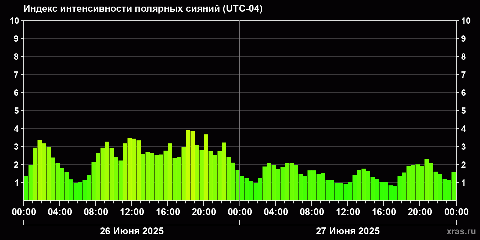 Изменения индекса интенсивности полярных сияний с 2025-06-26 по 2025-06-27 по местному времени