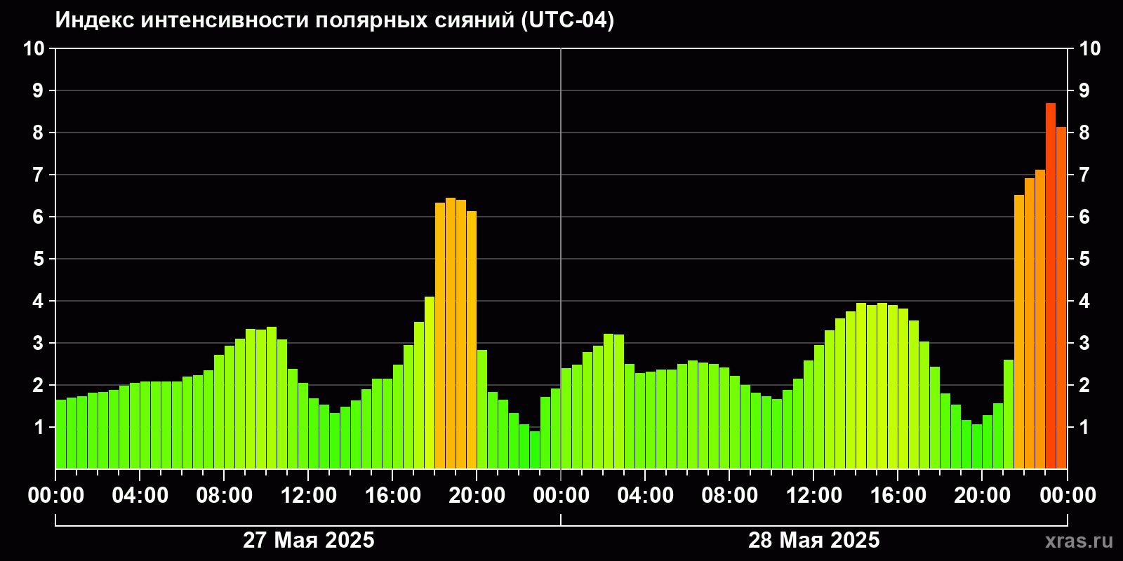 Изменения индекса интенсивности полярных сияний с 2025-05-27 по 2025-05-28 по местному времени