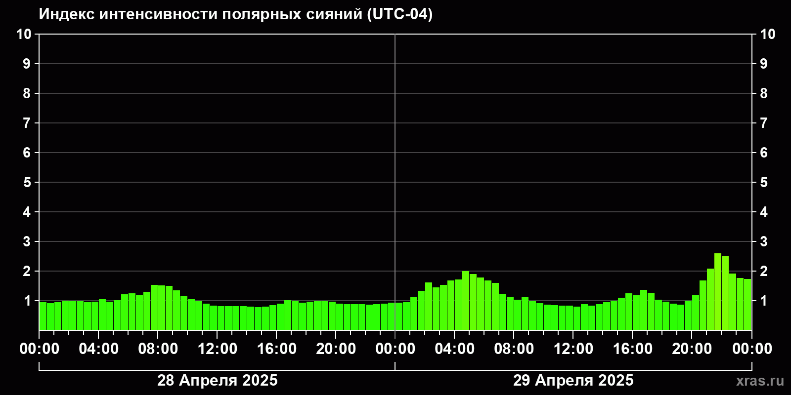 Изменения индекса интенсивности полярных сияний с 2025-04-28 по 2025-04-29 по местному времени