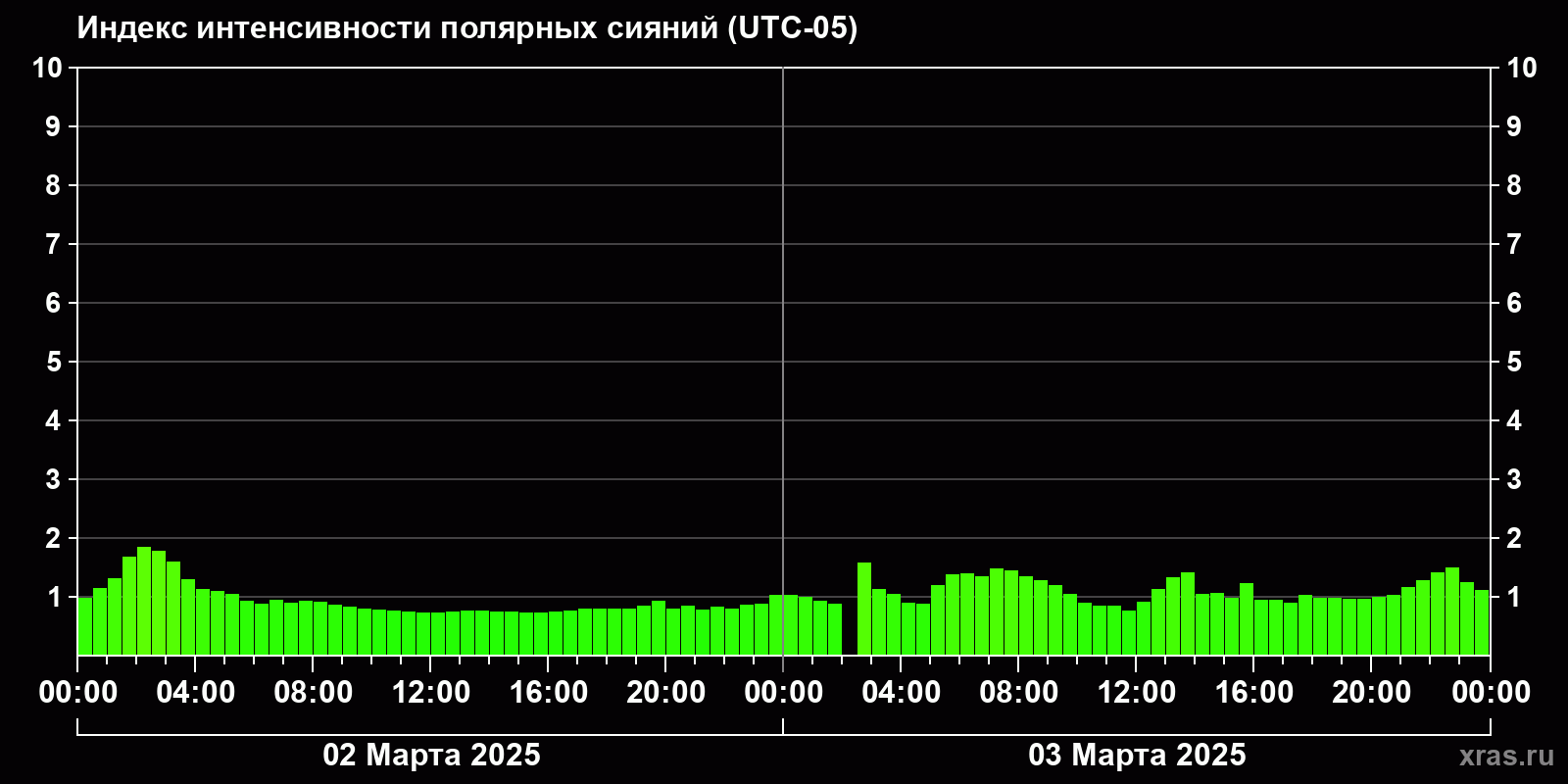 Изменения индекса интенсивности полярных сияний с 2025-03-02 по 2025-03-03 по местному времени