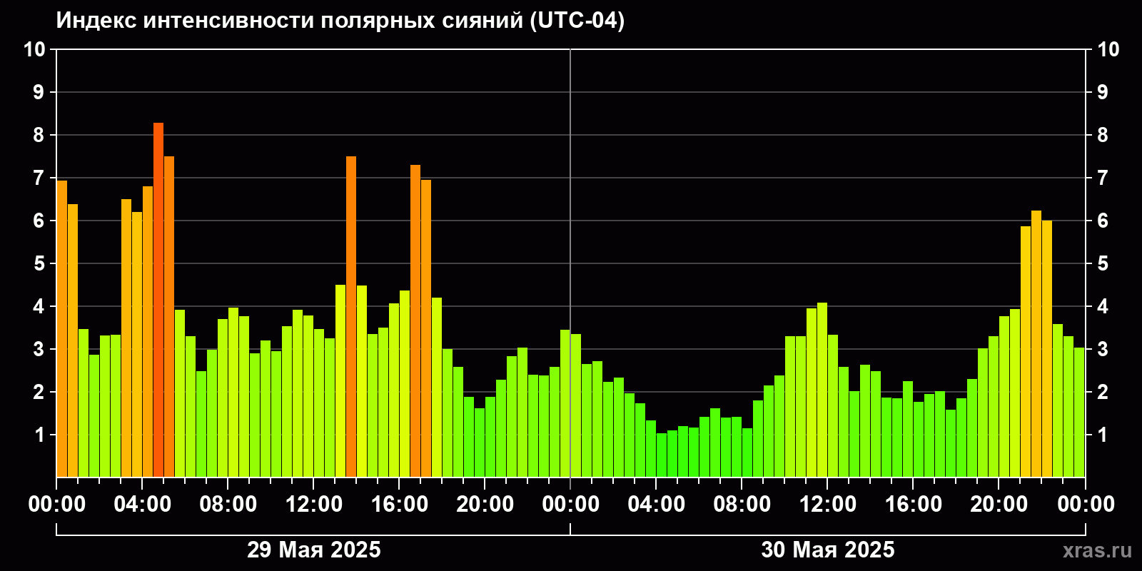 Изменения индекса интенсивности полярных сияний с 2025-05-29 по 2025-05-30 по местному времени