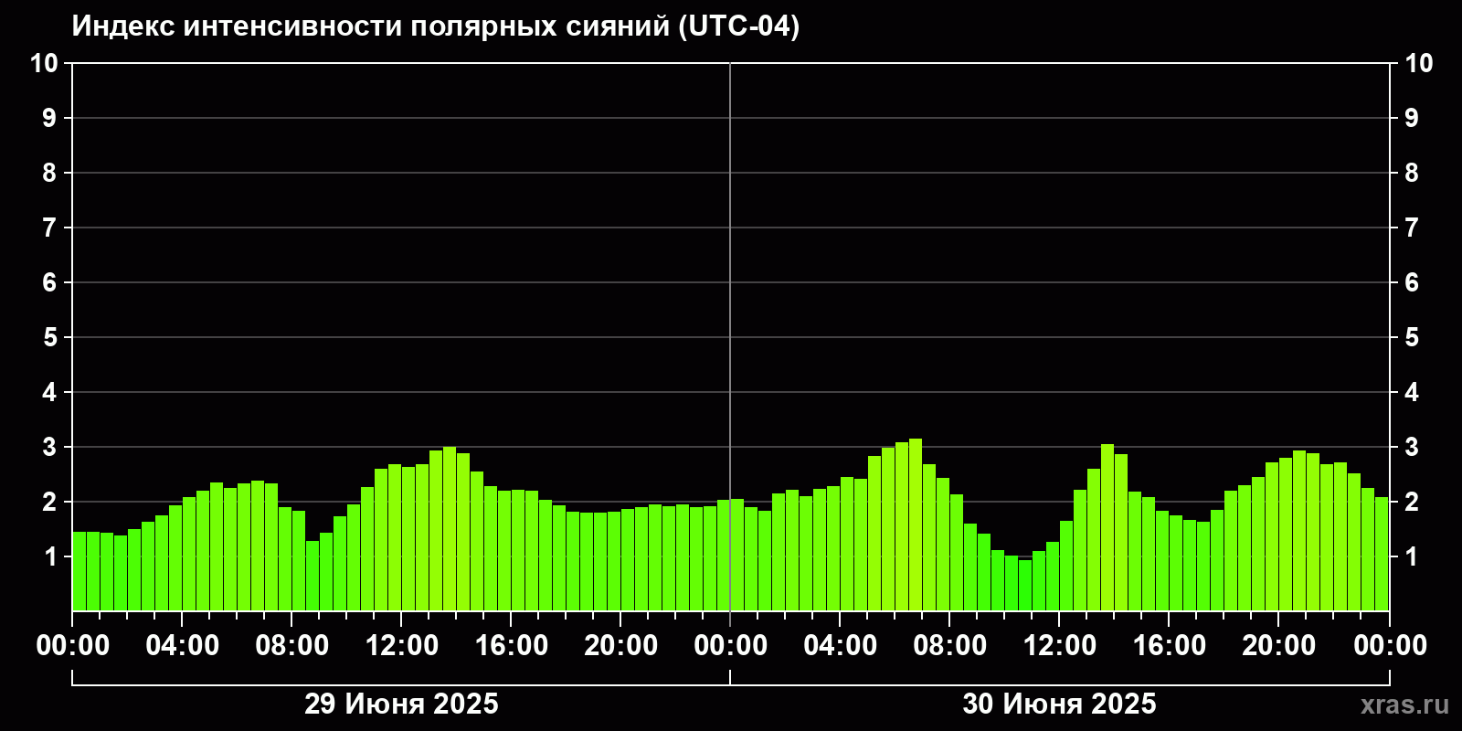 Изменения индекса интенсивности полярных сияний с 2025-06-29 по 2025-06-30 по местному времени