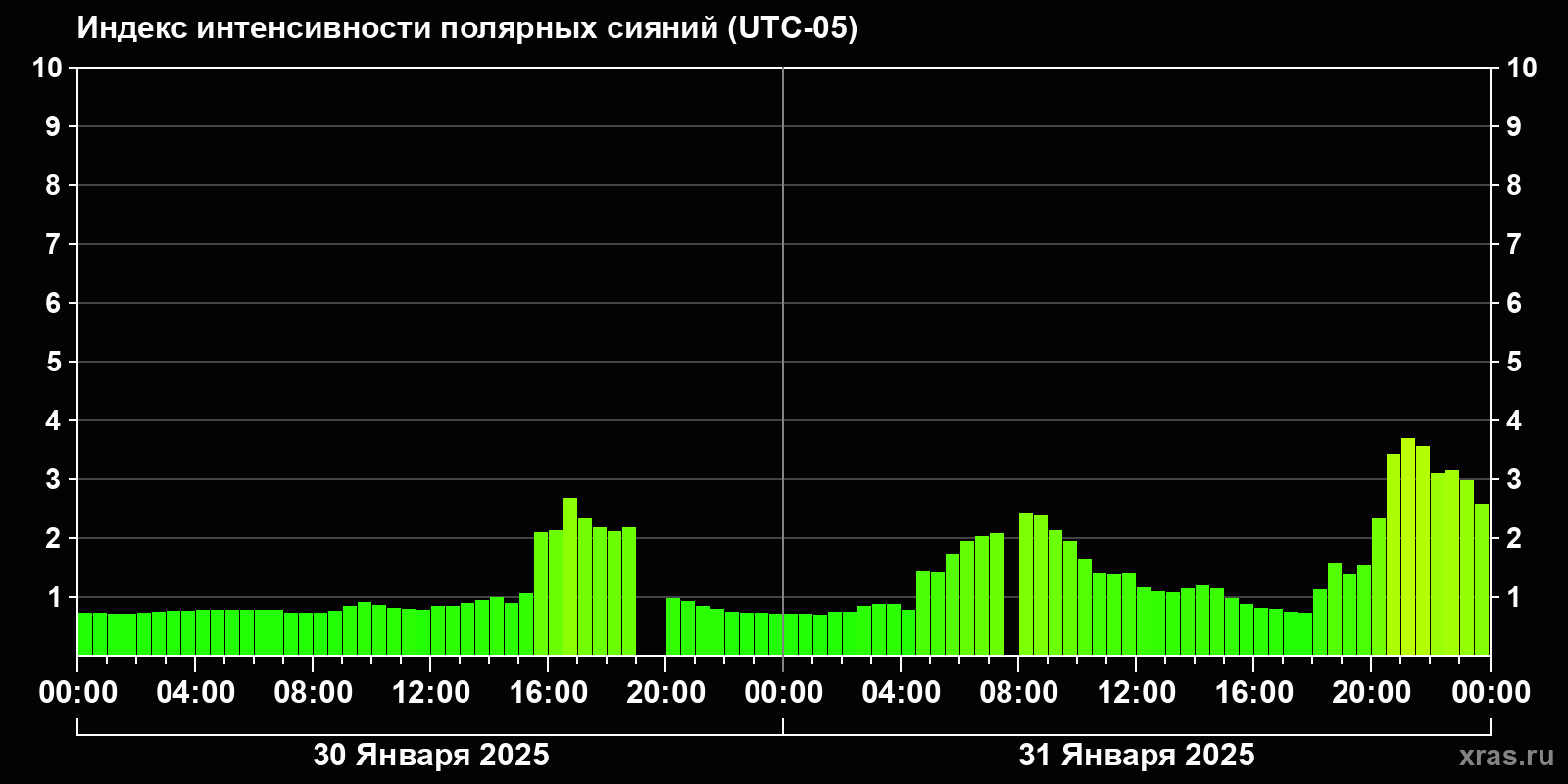 Изменения индекса интенсивности полярных сияний с 2025-01-30 по 2025-01-31 по местному времени