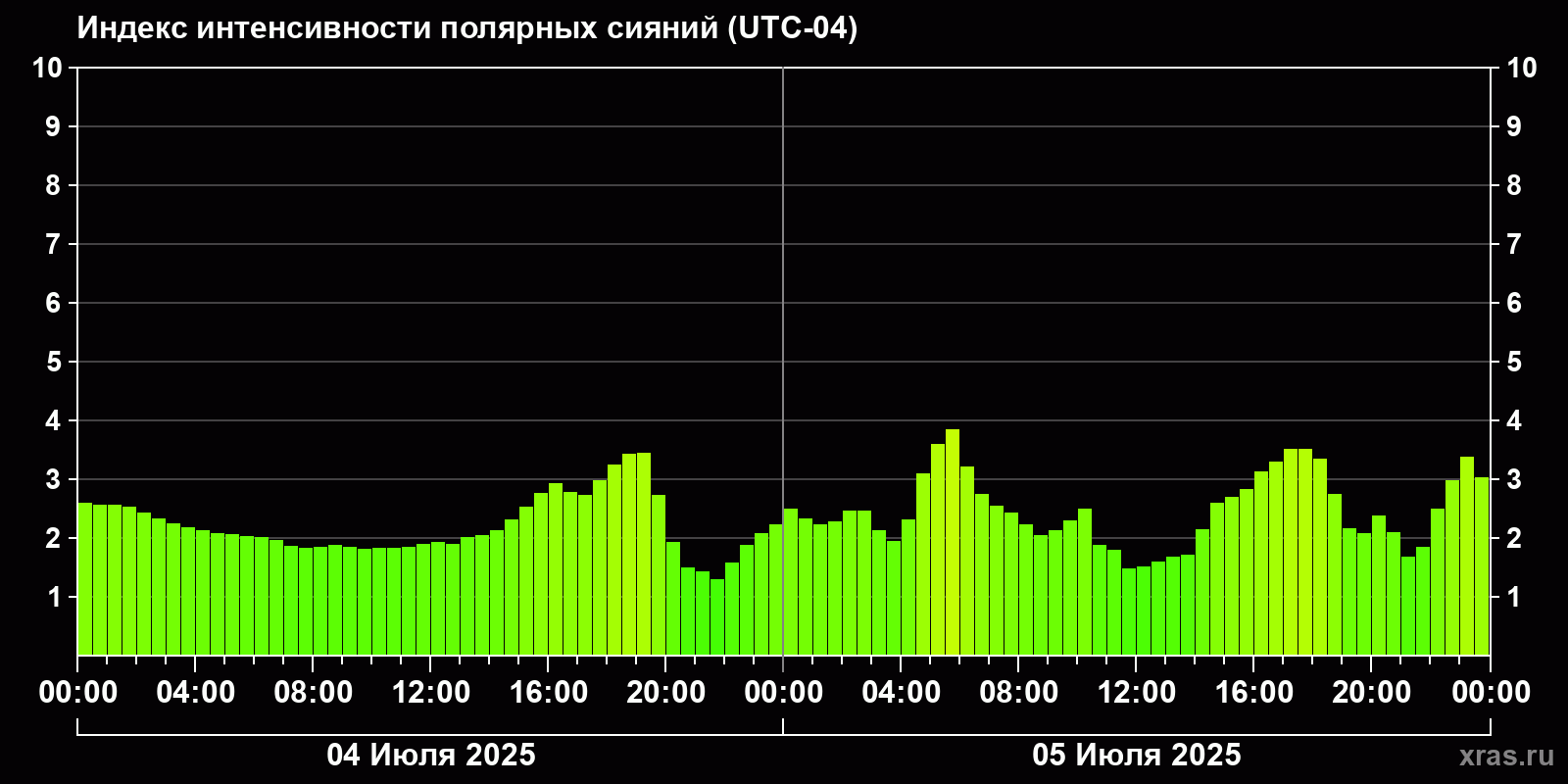 Изменения индекса интенсивности полярных сияний с 2025-07-04 по 2025-07-05 по местному времени