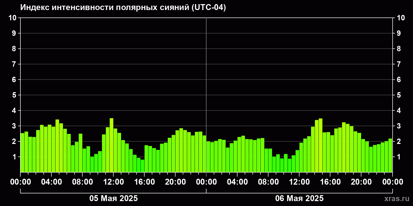 Изменения индекса интенсивности полярных сияний с 2025-05-05 по 2025-05-06 по местному времени