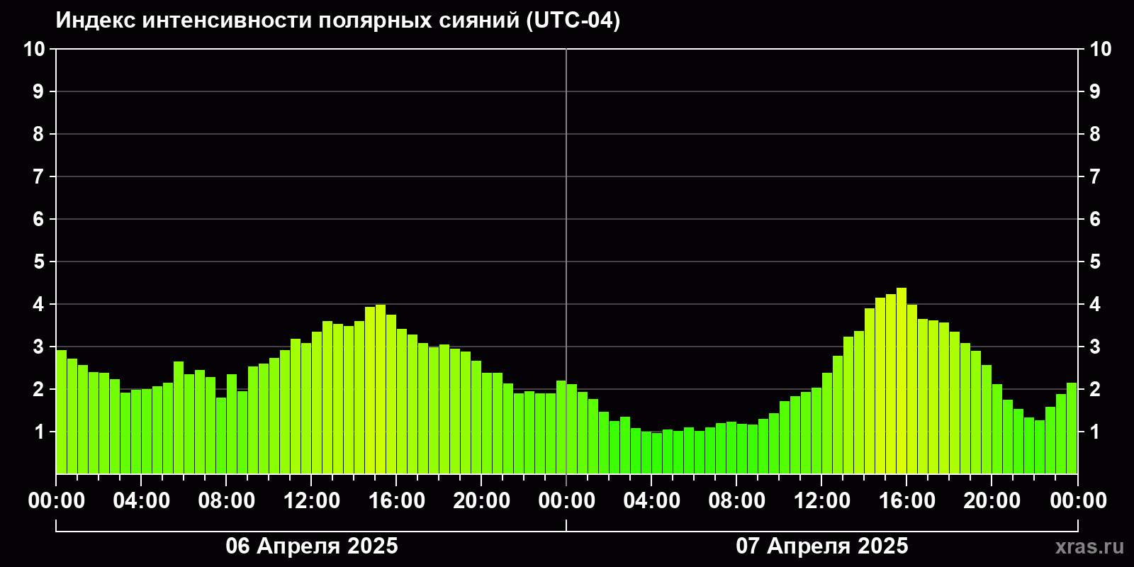 Изменения индекса интенсивности полярных сияний с 2025-04-06 по 2025-04-07 по местному времени