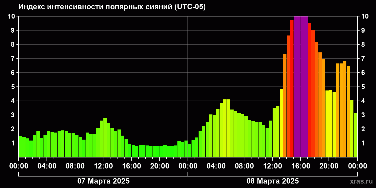 Изменения индекса интенсивности полярных сияний с 2025-03-07 по 2025-03-08 по местному времени