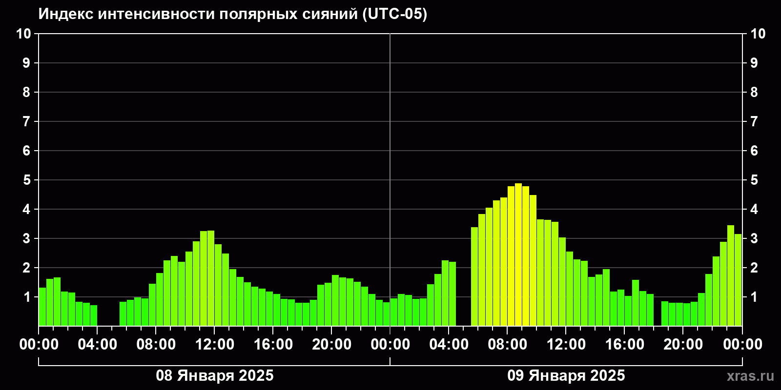 Изменения индекса интенсивности полярных сияний с 2025-01-08 по 2025-01-09 по местному времени