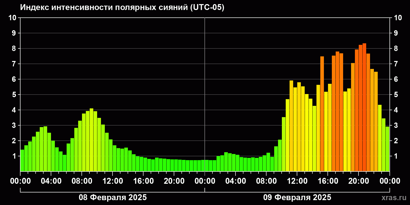 Изменения индекса интенсивности полярных сияний с 2025-02-08 по 2025-02-09 по местному времени