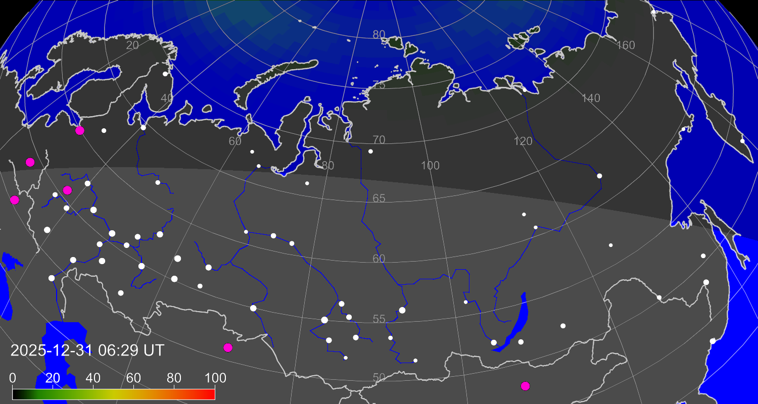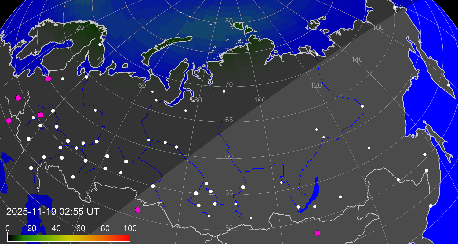 Вероятность полярных сияний в городах Российской Федерации