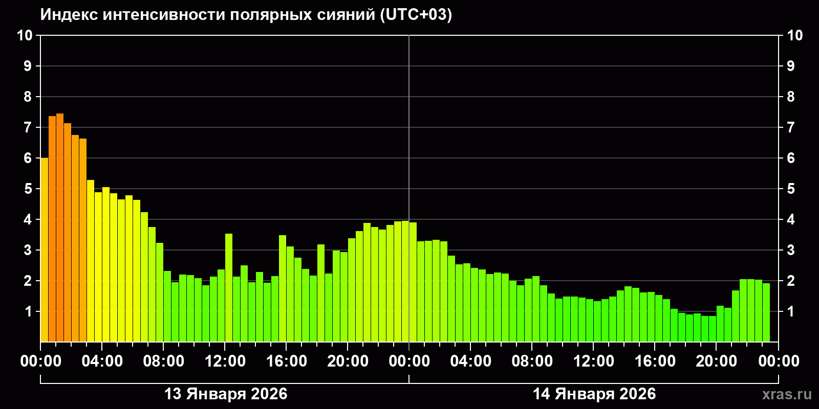 Изменения индекса интенсивности полярных сияний с 2026-01-13 по 2026-01-14 по местному времени