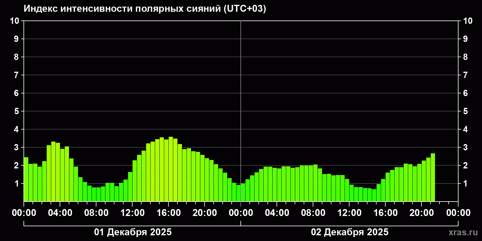 Изменения индекса интенсивности полярных сияний с 2025-12-01 по 2025-12-02 по местному времени