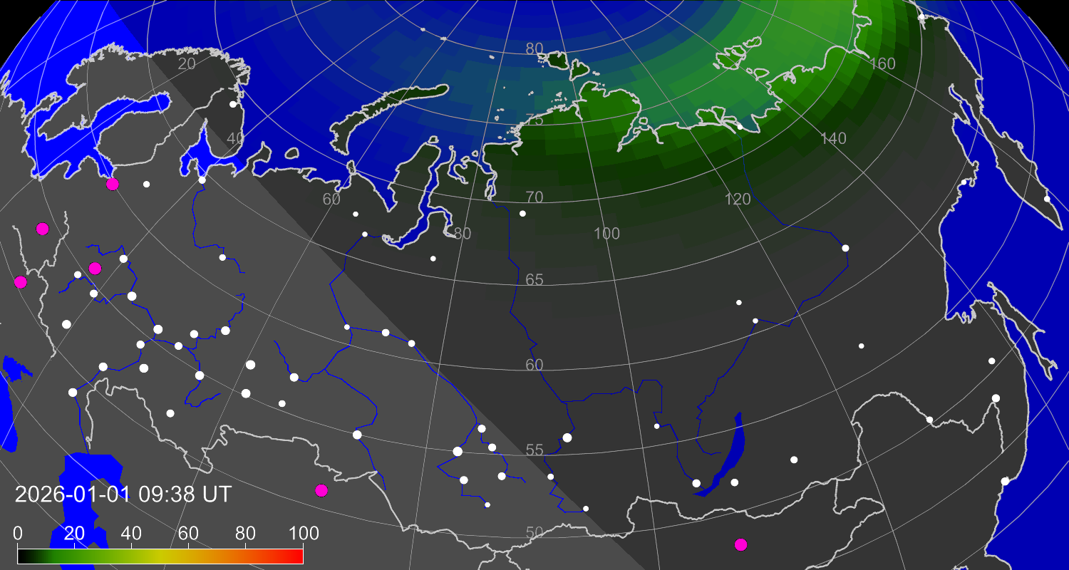 Индекс интенсивности полярных сияний и теоретически возможная широта наблюдений для ночного времени в восточном полушарии