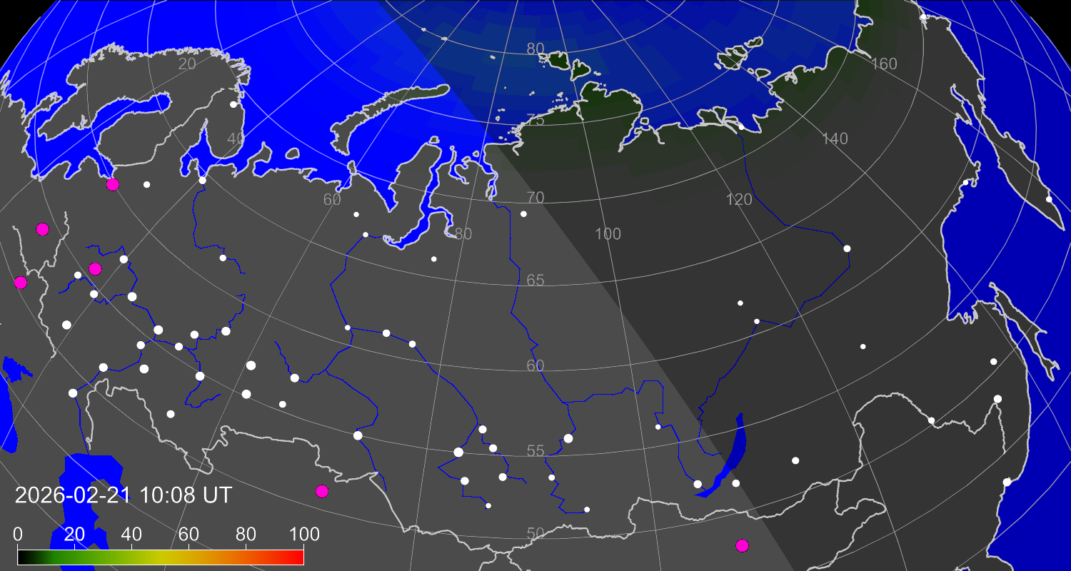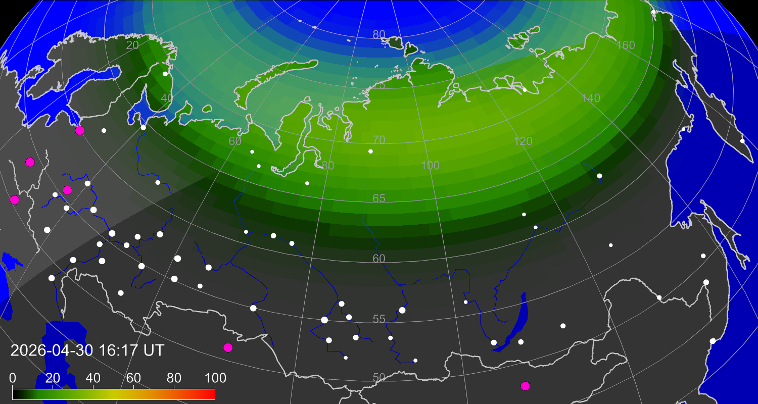 Вероятность полярных сияний в городах Российской Федерации