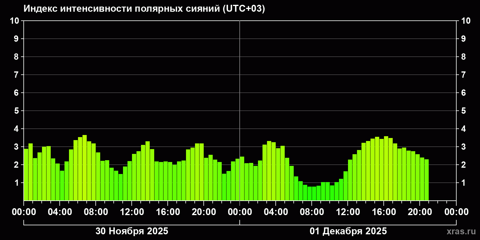 Изменения индекса интенсивности полярных сияний с 2025-11-30 по 2025-12-01 по местному времени