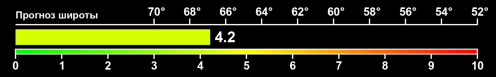 Индекс интенсивности полярных сияний и теоретически возможная широта наблюдений для ночного времени в восточном полушарии по состоянию на 2026-03-22 23:57 (конец дня) по местному времени