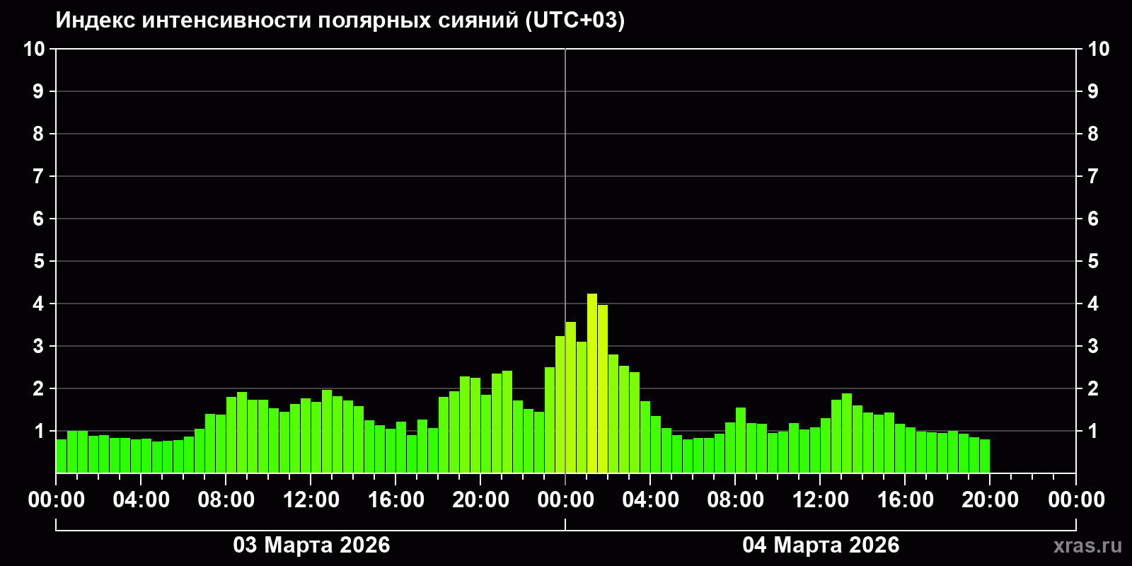 Изменения индекса интенсивности полярных сияний с 2026-03-03 по 2026-03-04 по местному времени