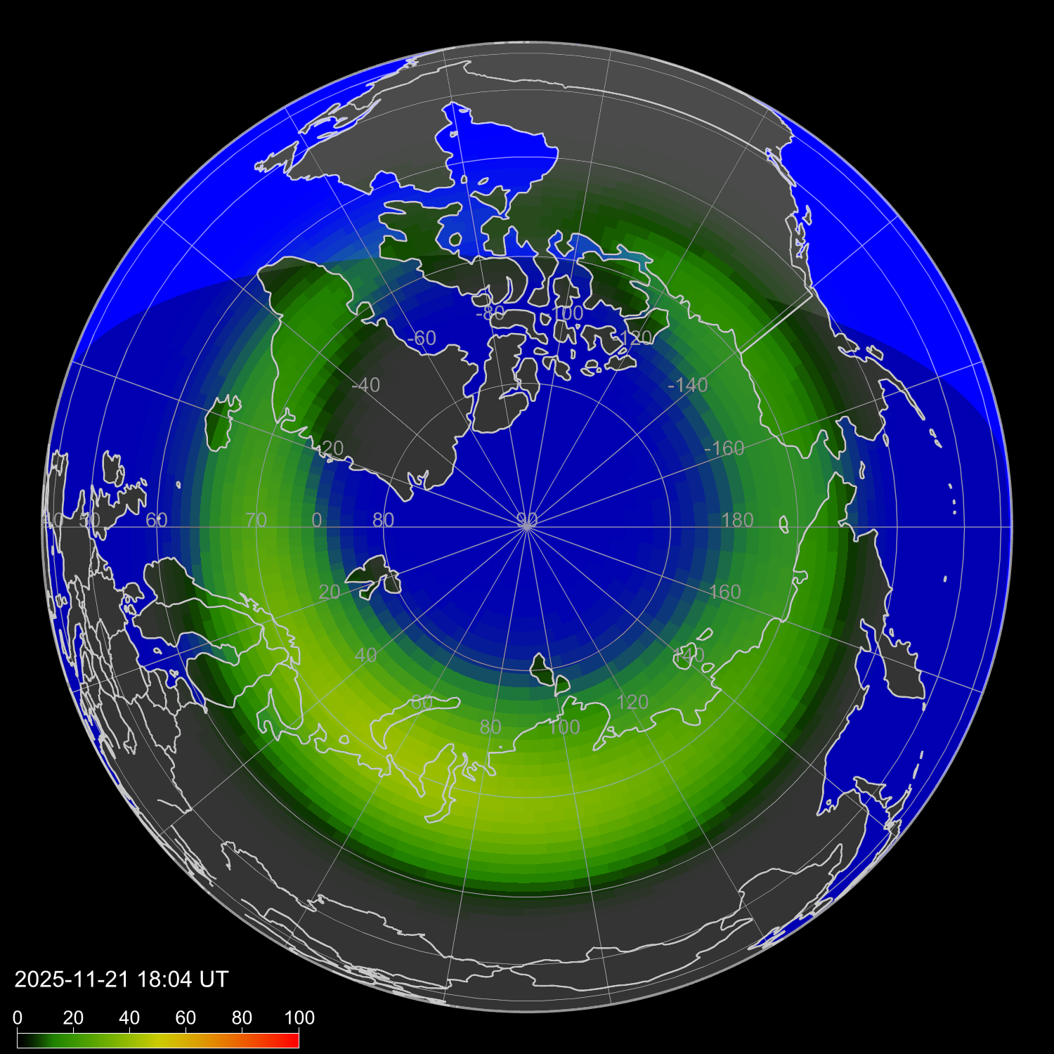 Изменения и часовой прогноз индекса интенсивности полярных сияний с 2025-11-20 по 2025-11-21