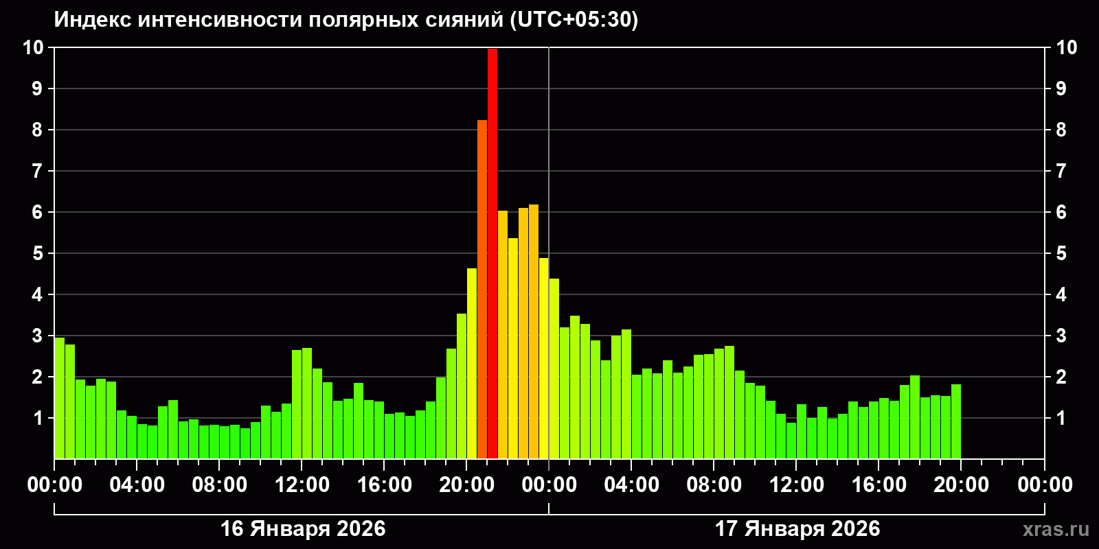 Изменения индекса интенсивности полярных сияний с 2026-01-16 по 2026-01-17 по местному времени