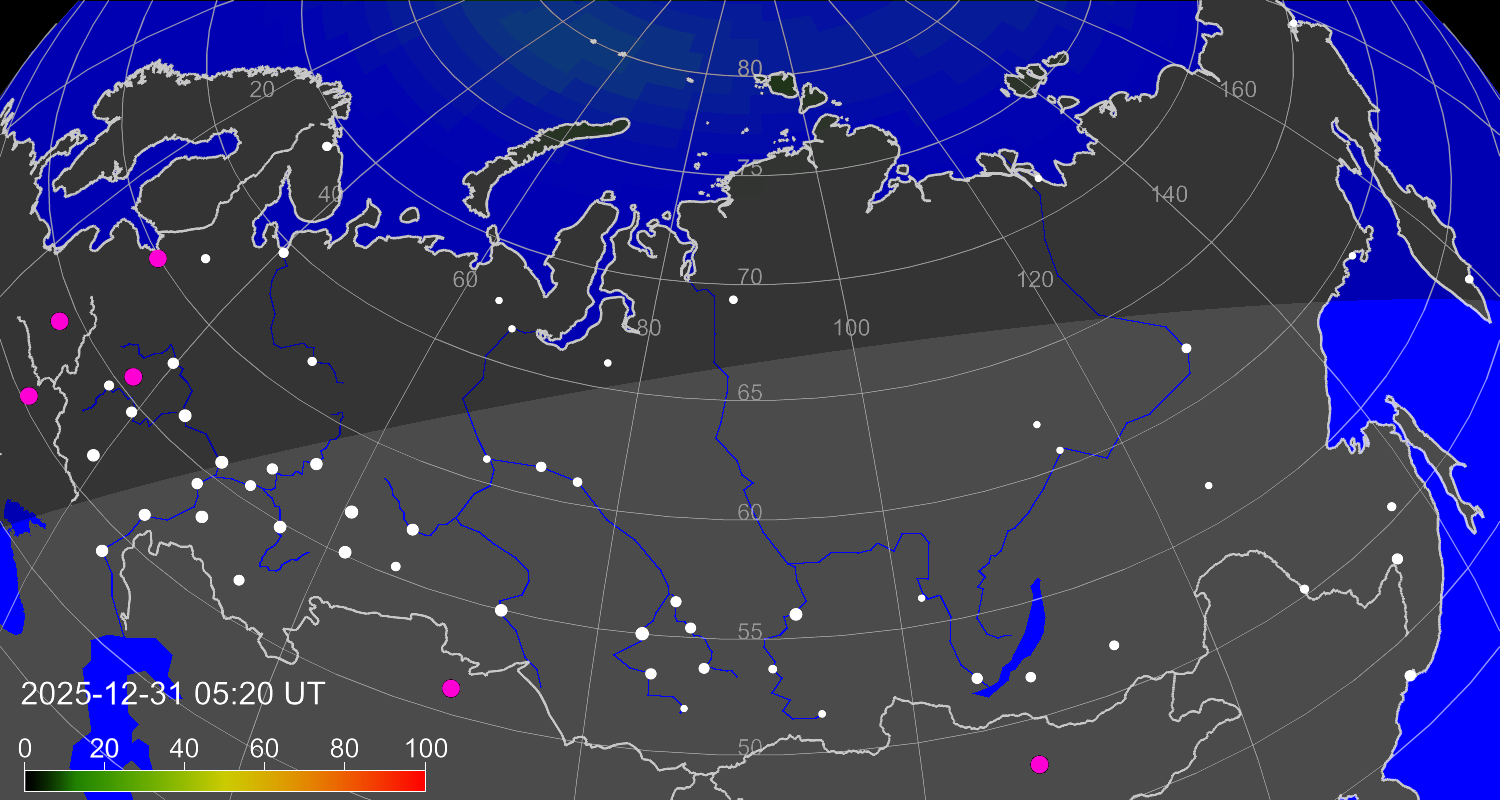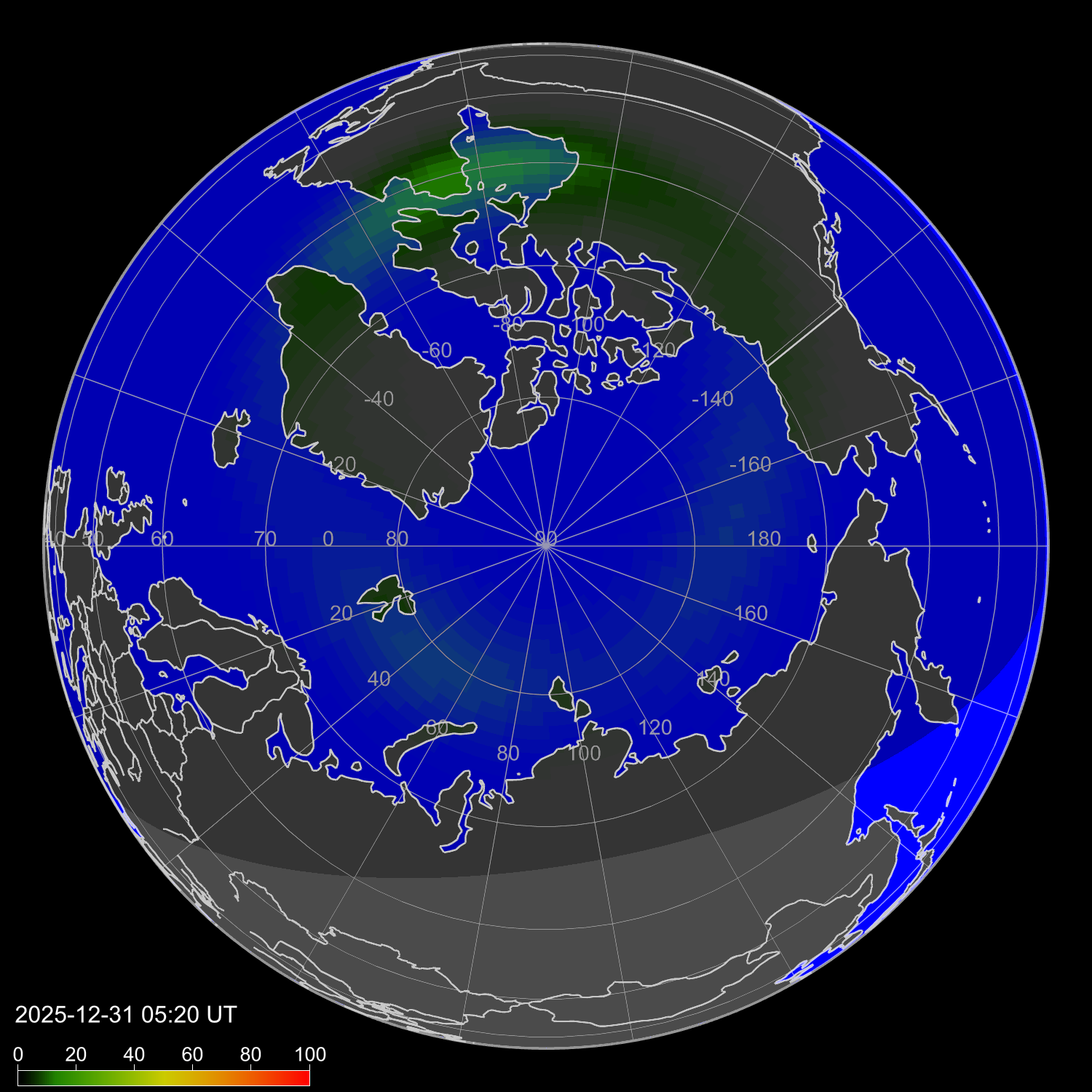 Изменения и часовой прогноз индекса интенсивности полярных сияний с 2025-12-31 по 2026-01-01
