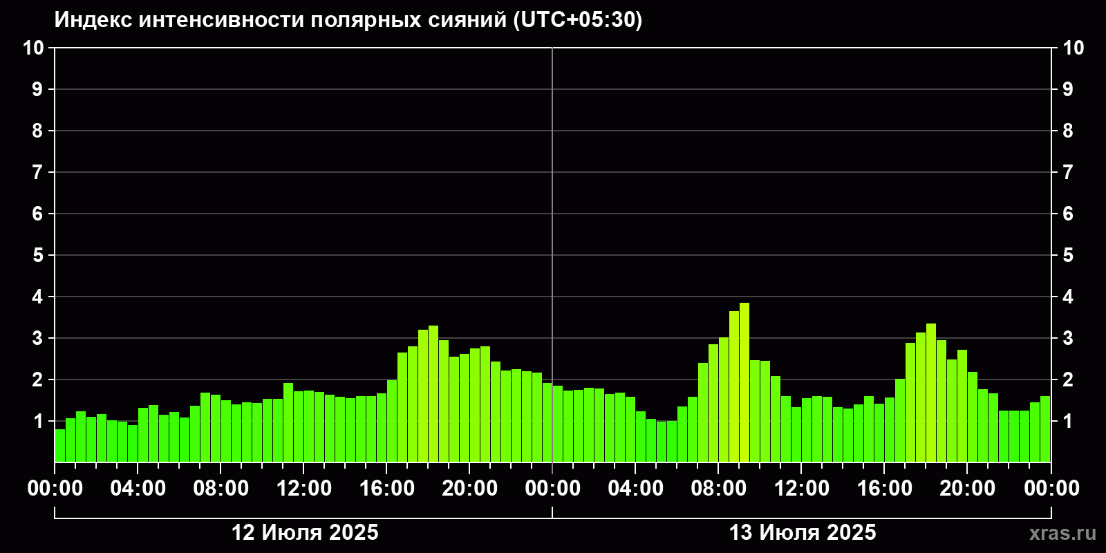Изменения индекса интенсивности полярных сияний с 2025-07-12 по 2025-07-13 по местному времени