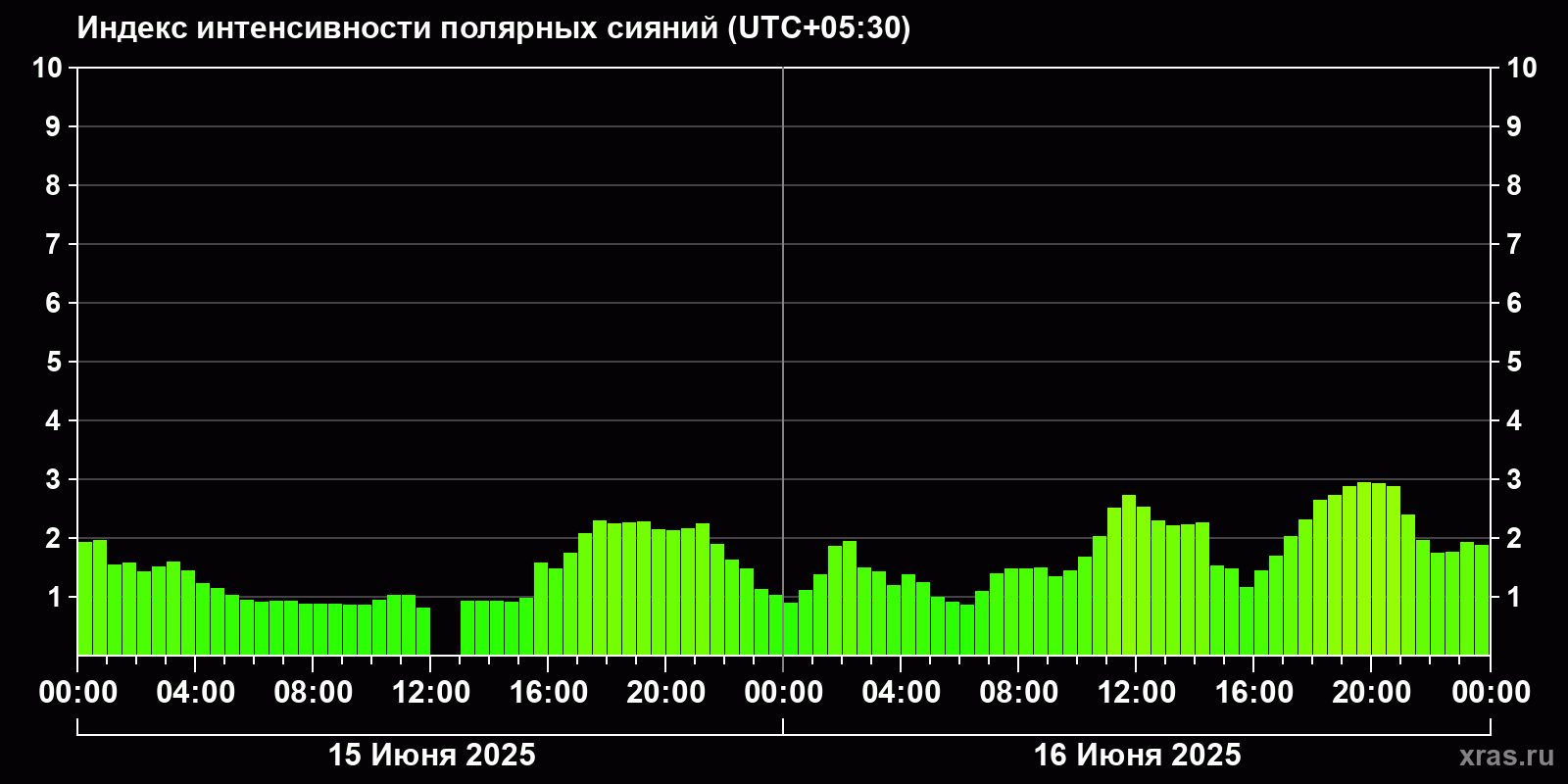 Изменения индекса интенсивности полярных сияний с 2025-06-15 по 2025-06-16 по местному времени