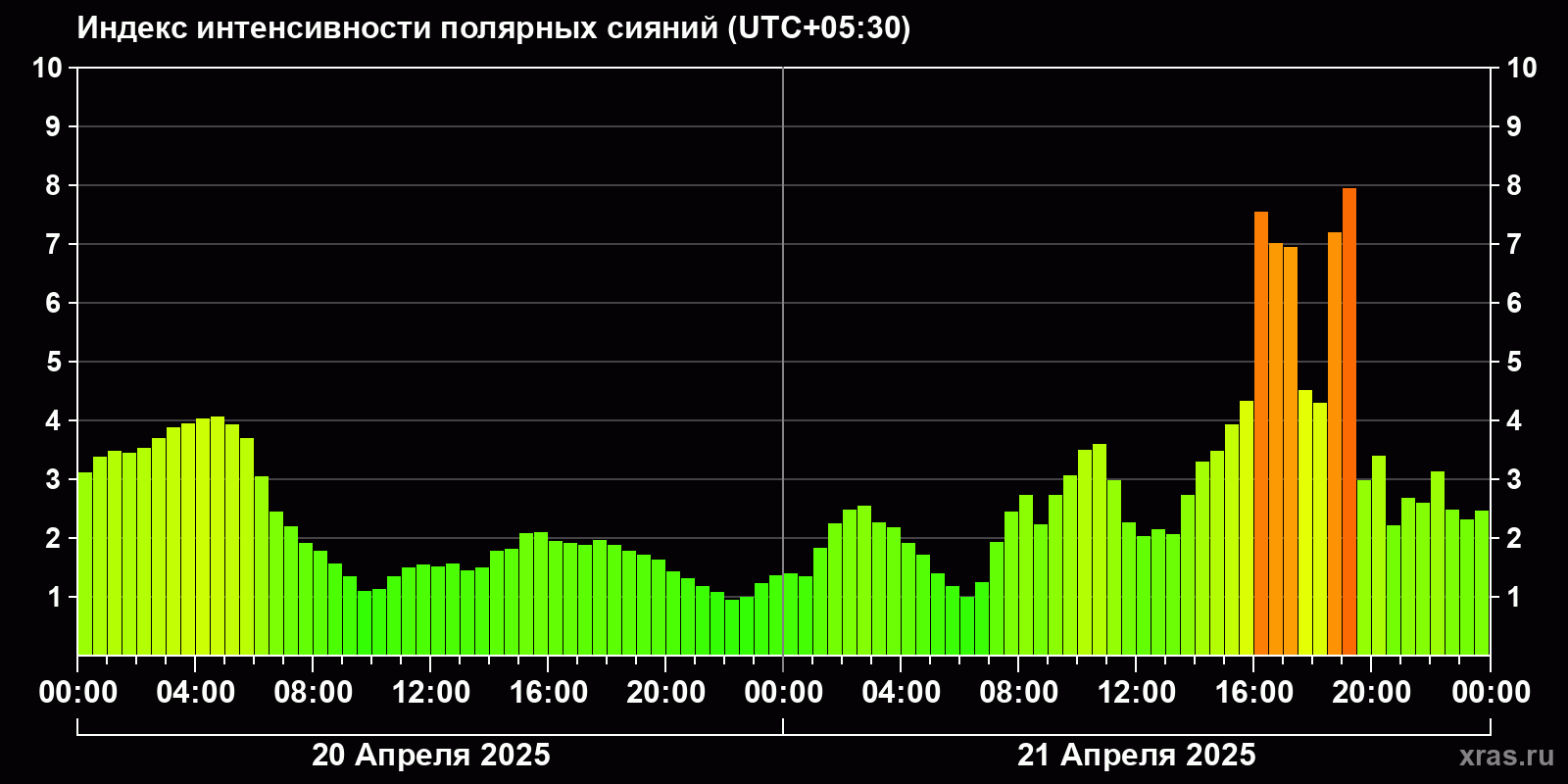 Изменения индекса интенсивности полярных сияний с 2025-04-20 по 2025-04-21 по местному времени