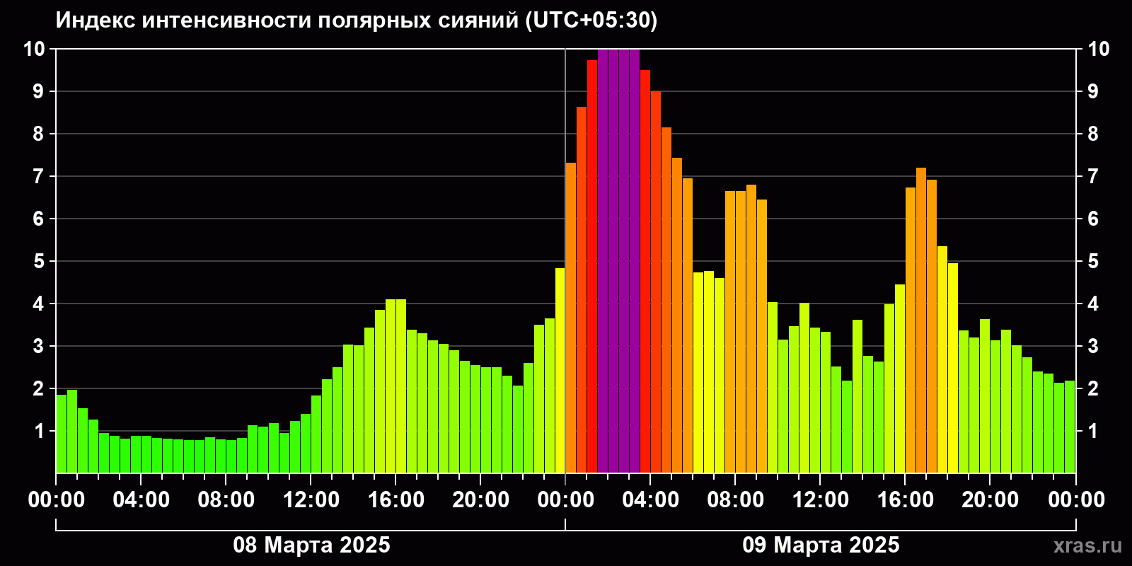 Изменения индекса интенсивности полярных сияний с 2025-03-08 по 2025-03-09 по местному времени