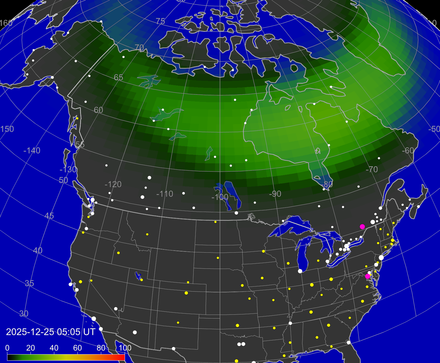 Изменения и часовой прогноз индекса интенсивности полярных сияний с 2025-12-23 по 2025-12-24