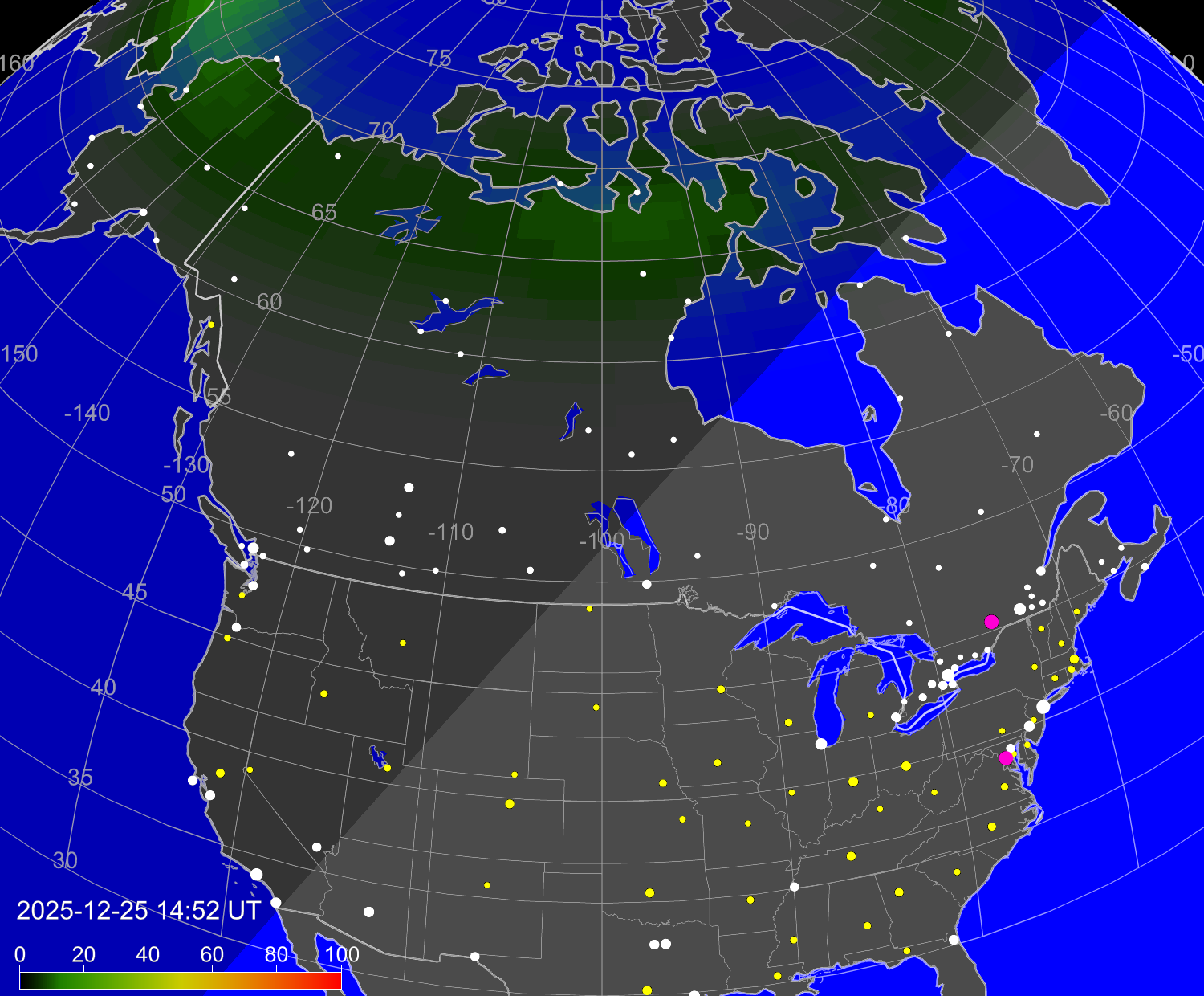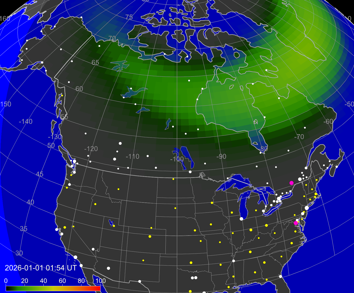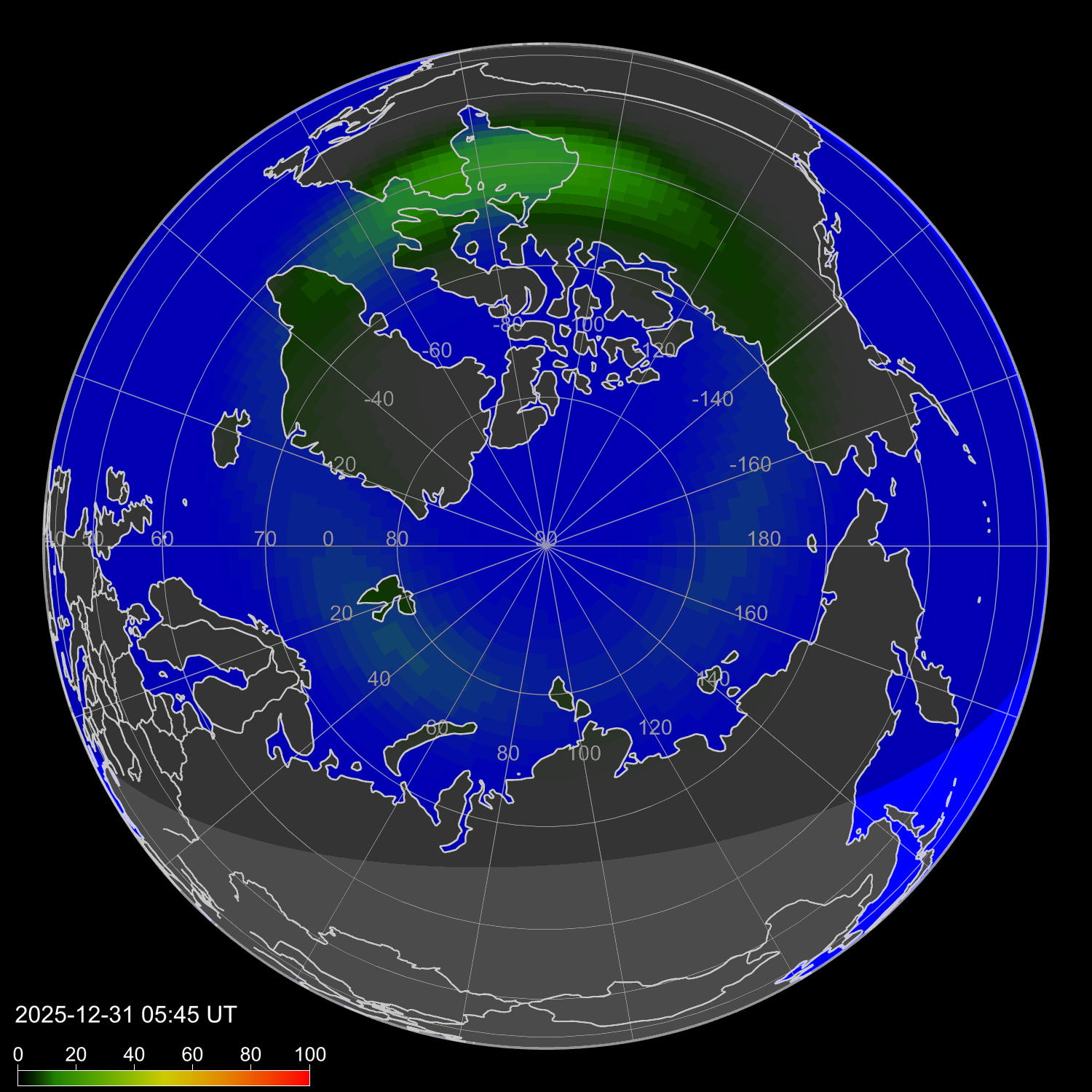 Индекс интенсивности полярных сияний и теоретически возможная широта наблюдений для ночного времени в западном полушарии