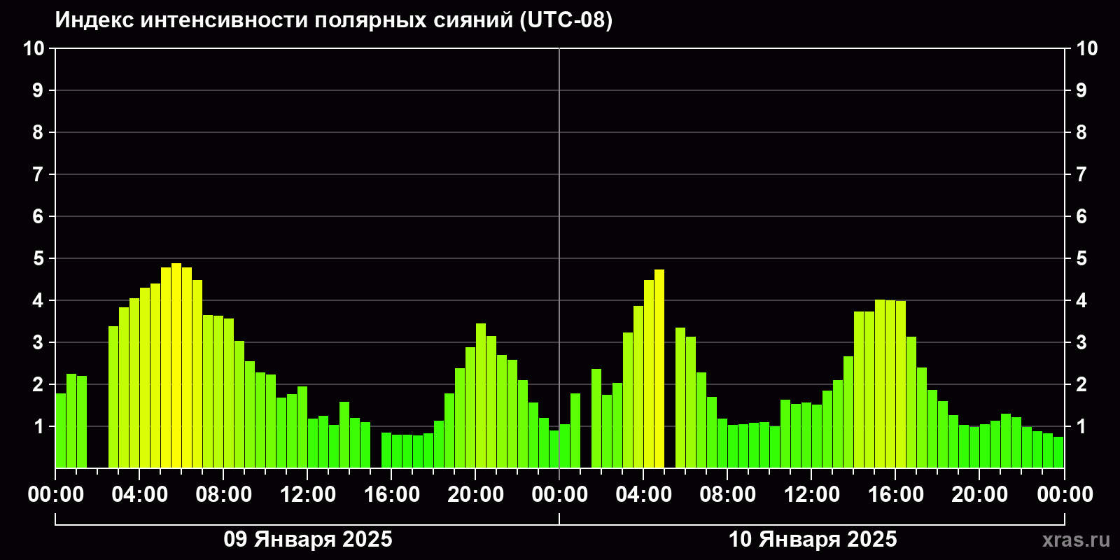 Изменения индекса интенсивности полярных сияний с 2025-01-09 по 2025-01-10 по местному времени