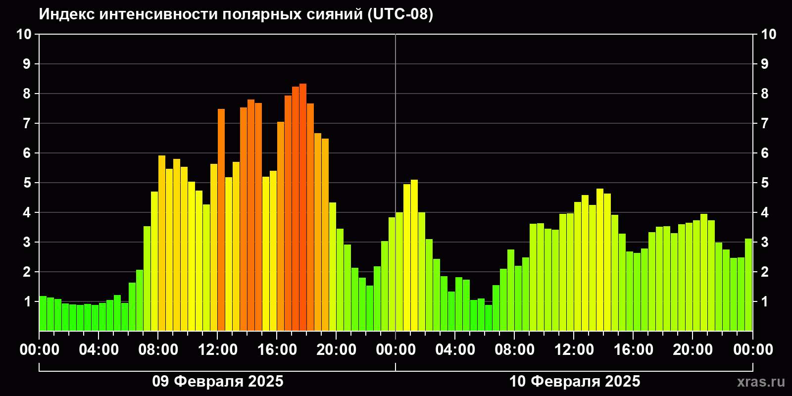Изменения индекса интенсивности полярных сияний с 2025-02-09 по 2025-02-10 по местному времени