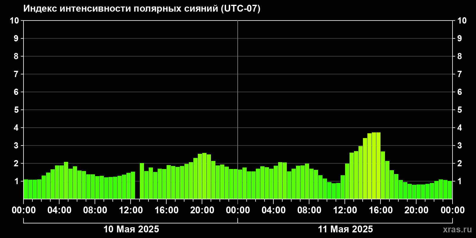 Изменения индекса интенсивности полярных сияний с 2025-05-10 по 2025-05-11 по местному времени