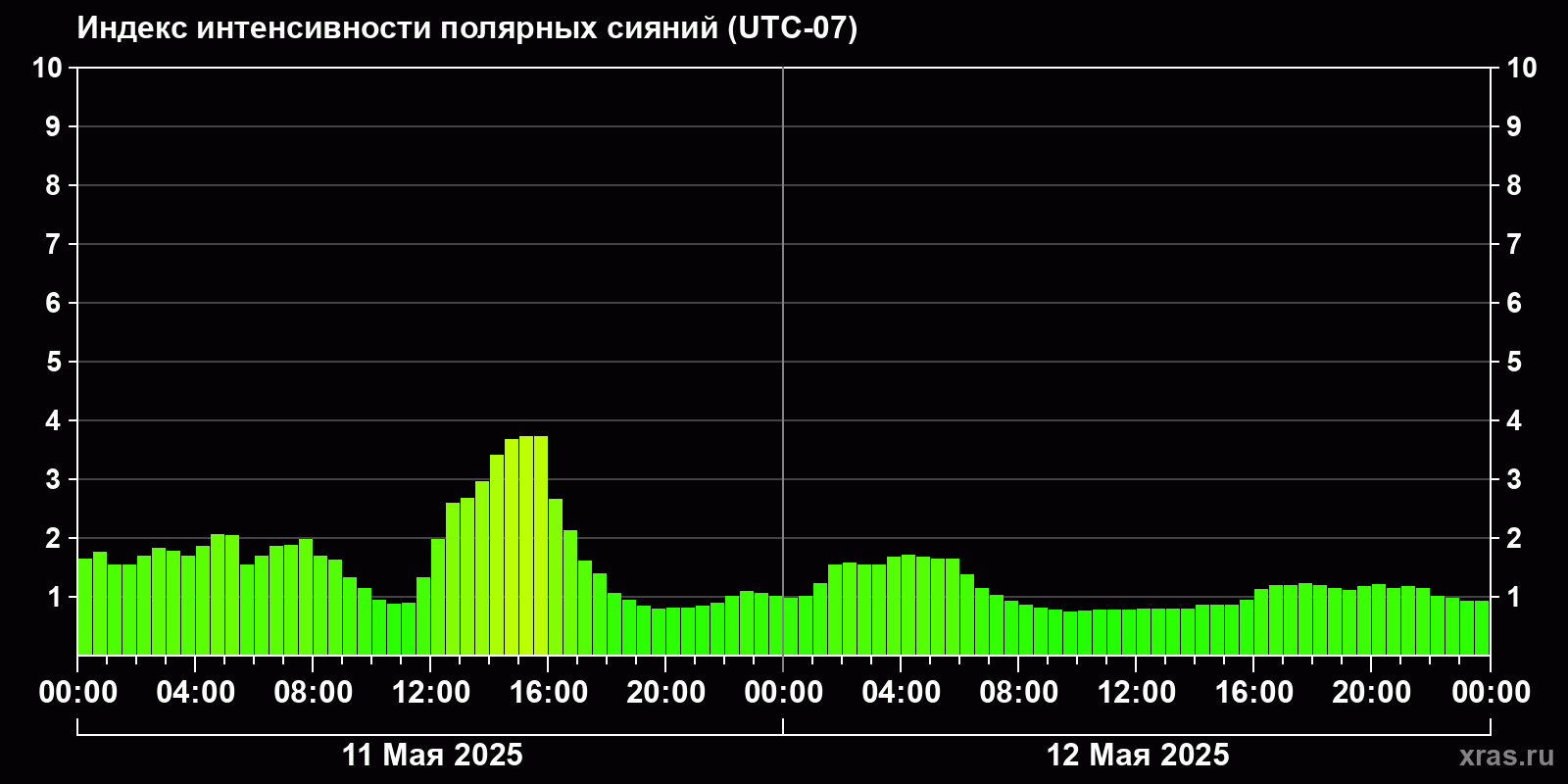Изменения индекса интенсивности полярных сияний с 2025-05-11 по 2025-05-12 по местному времени