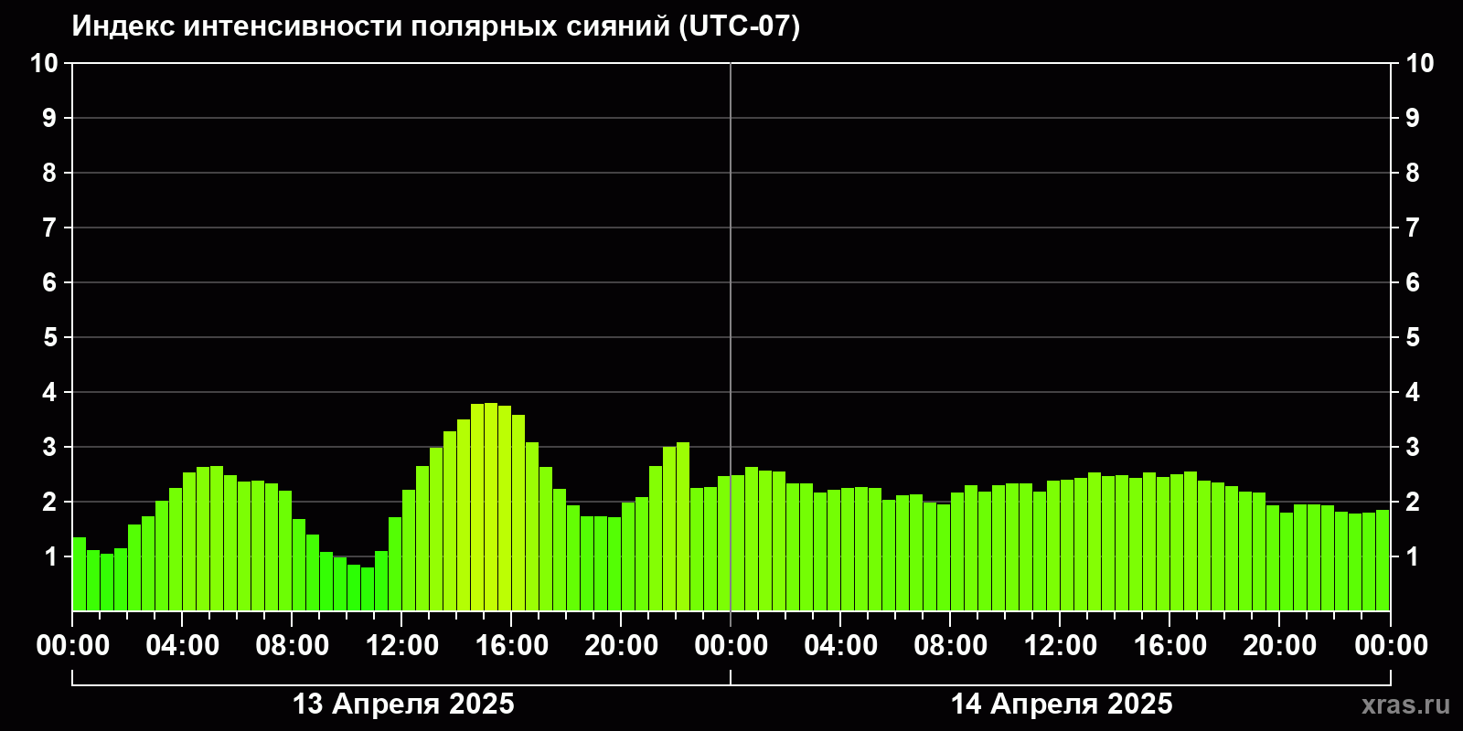 Изменения индекса интенсивности полярных сияний с 2025-04-13 по 2025-04-14 по местному времени