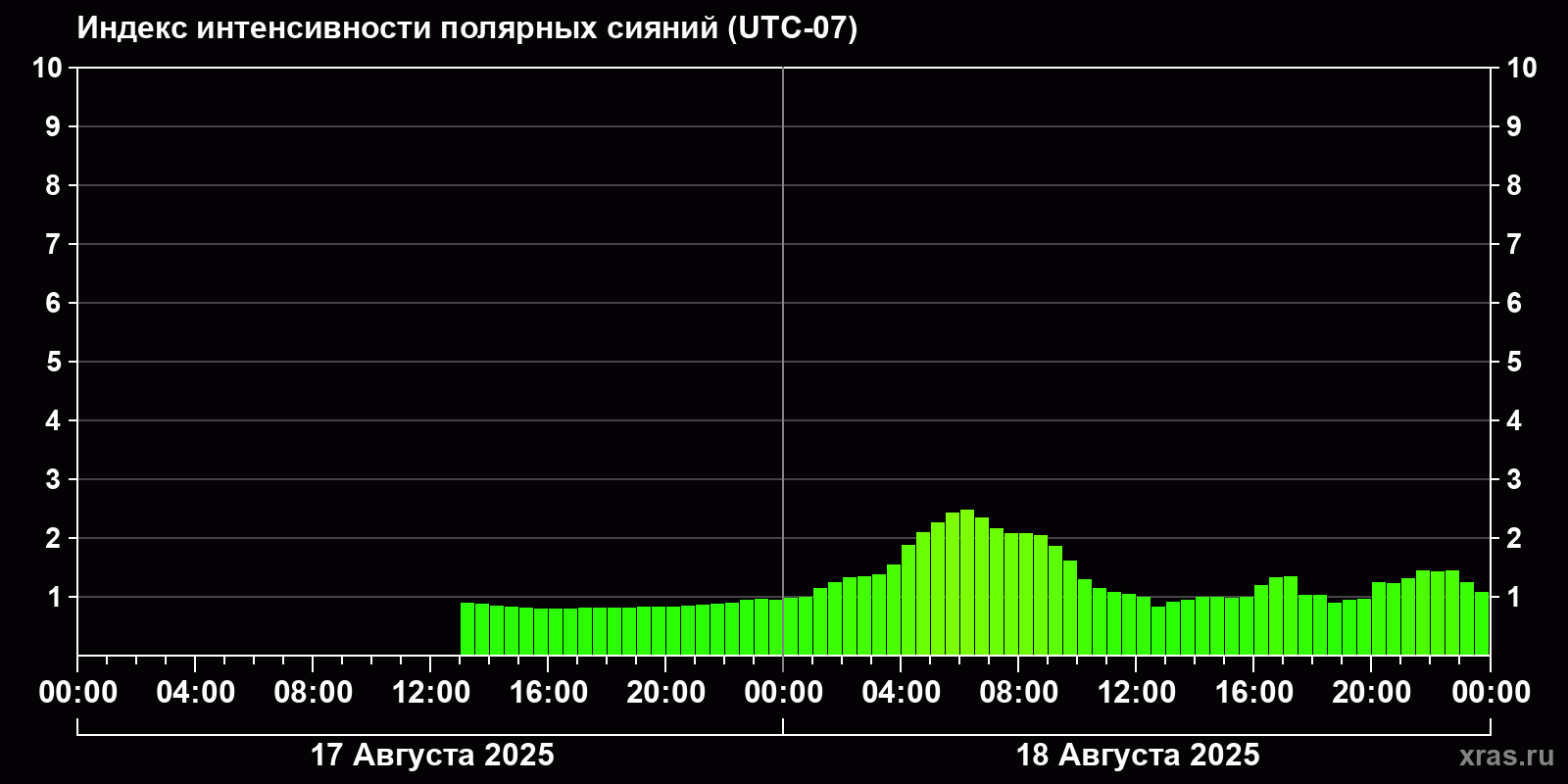 Изменения индекса интенсивности полярных сияний с 2025-08-17 по 2025-08-18 по местному времени