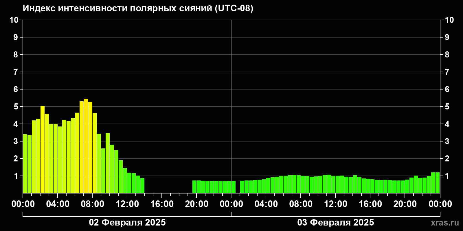 Изменения индекса интенсивности полярных сияний с 2025-02-02 по 2025-02-03 по местному времени