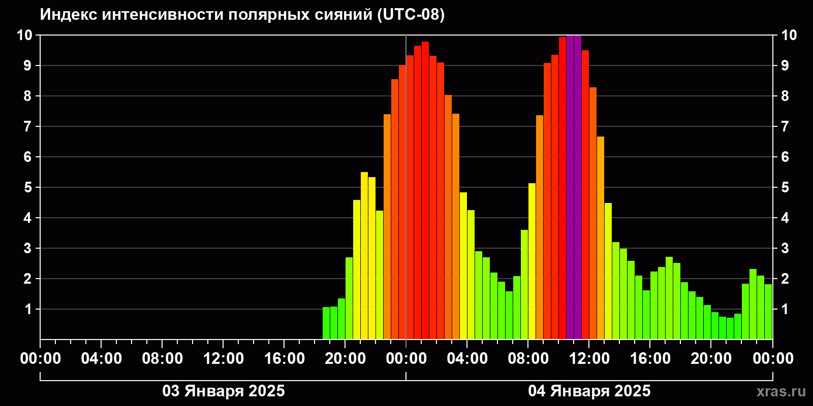 Изменения индекса интенсивности полярных сияний с 2025-01-03 по 2025-01-04 по местному времени
