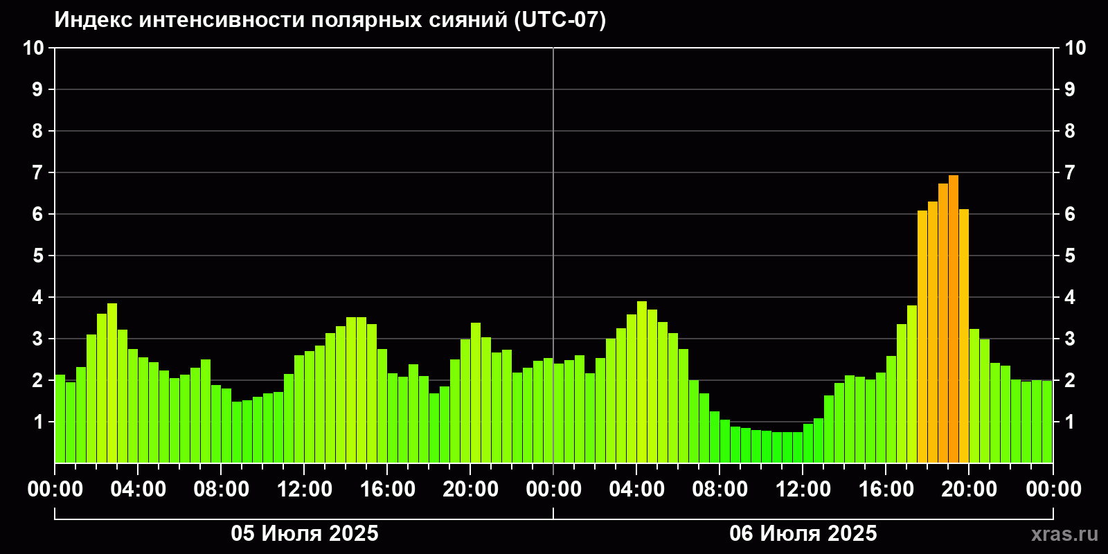 Изменения индекса интенсивности полярных сияний с 2025-07-05 по 2025-07-06 по местному времени