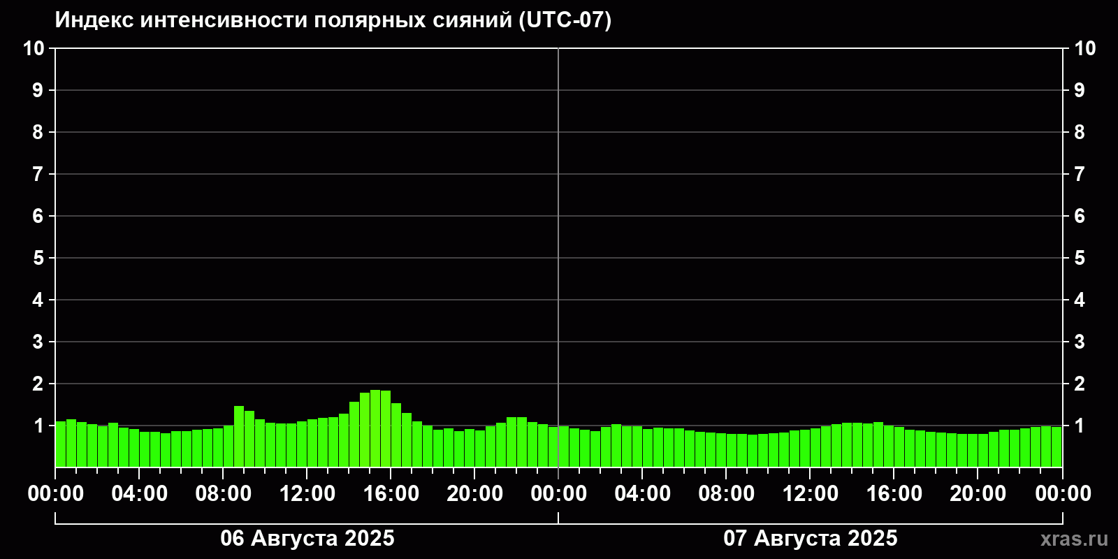 Изменения индекса интенсивности полярных сияний с 2025-08-06 по 2025-08-07 по местному времени