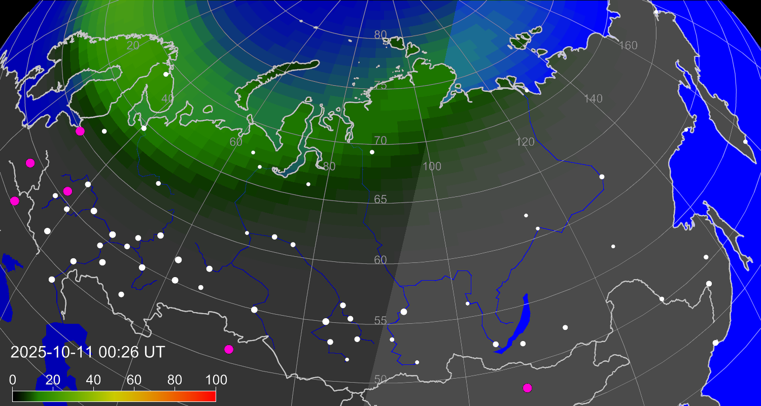 Изменения и часовой прогноз индекса интенсивности полярных сияний с 2025-10-10 по 2025-10-11