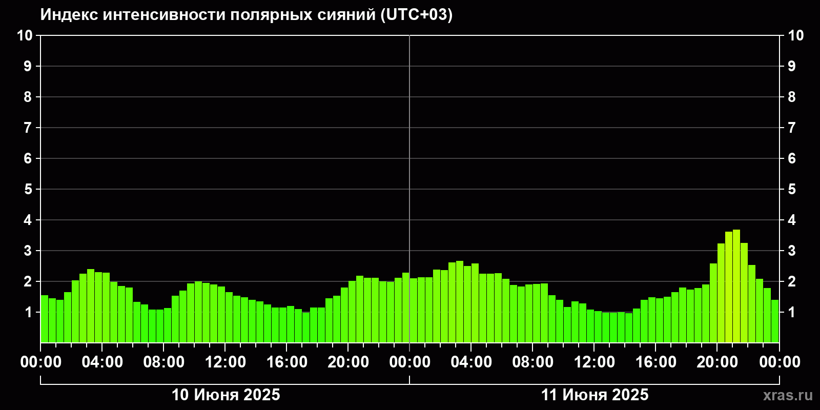 Изменения индекса интенсивности полярных сияний с 2025-06-10 по 2025-06-11 по местному времени